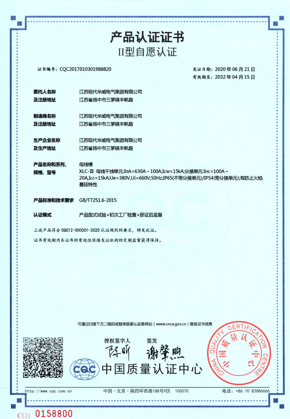 XLC-III母線槽-630A產(chǎn)品認(rèn)證證書